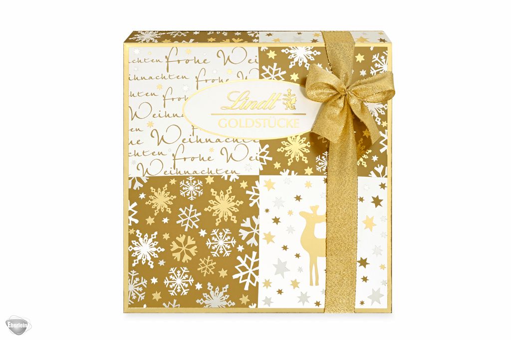 Wenn zu Weihnachten Gold und Weiß zusammentreffen, entsteht ein Hauch von Luxus. Die Maîtres Chocolatiers von Lindt haben mit viel Liebe zum Detail hochwertige Geschenke kreiert und sorgen mit den „Goldstücken“ für eine festliche Weihnachts-Stimmung. Diese hochwertige Packung ist gefüllt mit einer exklusiven Mischung feinster Lindt Pralinés.