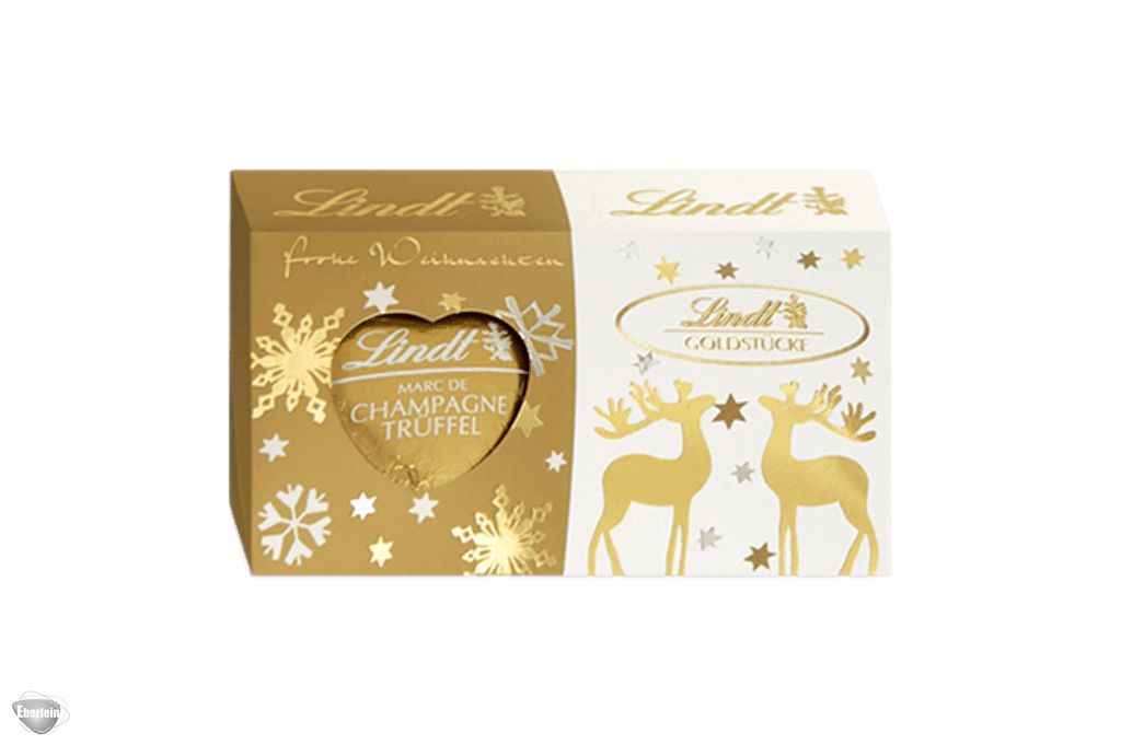 Wenn zu Weihnachten Gold und Weiß zusammentreffen, entsteht ein Hauch von Luxus. Die Maîtres Chocolatiers von Lindt haben mit viel Liebe zum Detail hochwertige Geschenke kreiert und sorgen mit den "Goldstücken" für eine festliche Weihnachts-Stimmung. Im Inneren dieses exklusiven Geschenkes verbergen sich zwei Herzen aus feiner Lindt Schokolade mit einer edlen Marc de Champagne Trüffel Füllung.