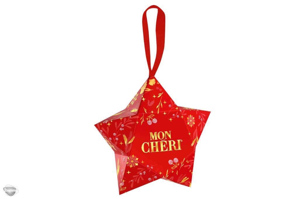Zartbitter-Pralinen mit einer fruchtigen Kirsche und dem feinen Likör in einer sternförmigen Verpackung, welche sich perfekt als Christbaumschmuck eignet.