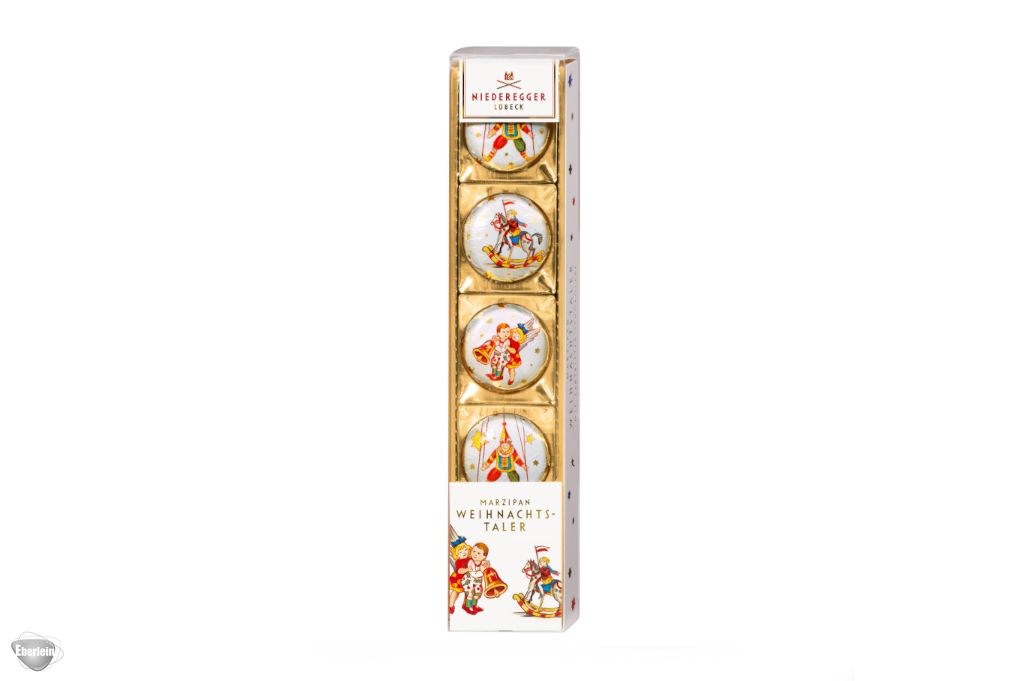 Nostalgisch und verspielt - die Niederegger Marzipan Weihnachtstaler bringen festlichen Genuss in mundgerechter Form auf Ihren Weihnachtsteller. Die feinen Taler aus edlem Marzipan sind von einer knackigen Zartbitterschokoladenhülle umgeben, die jedem Bissen eine besondere Tiefe verleiht und die Praline zum Hochgenuss macht. Die liebevoll gestaltete Verpackung mit weihnachtlichen Nostalgie-Motiven macht die Taler nicht nur geschmacklich, sondern auch optisch zu einem Highlight der Adventszeit. Ideal zum Teilen, Dekorieren oder einfach zum selbst Genießen - ein Klassiker, der Tradition und Genuss harmonisch vereint.
