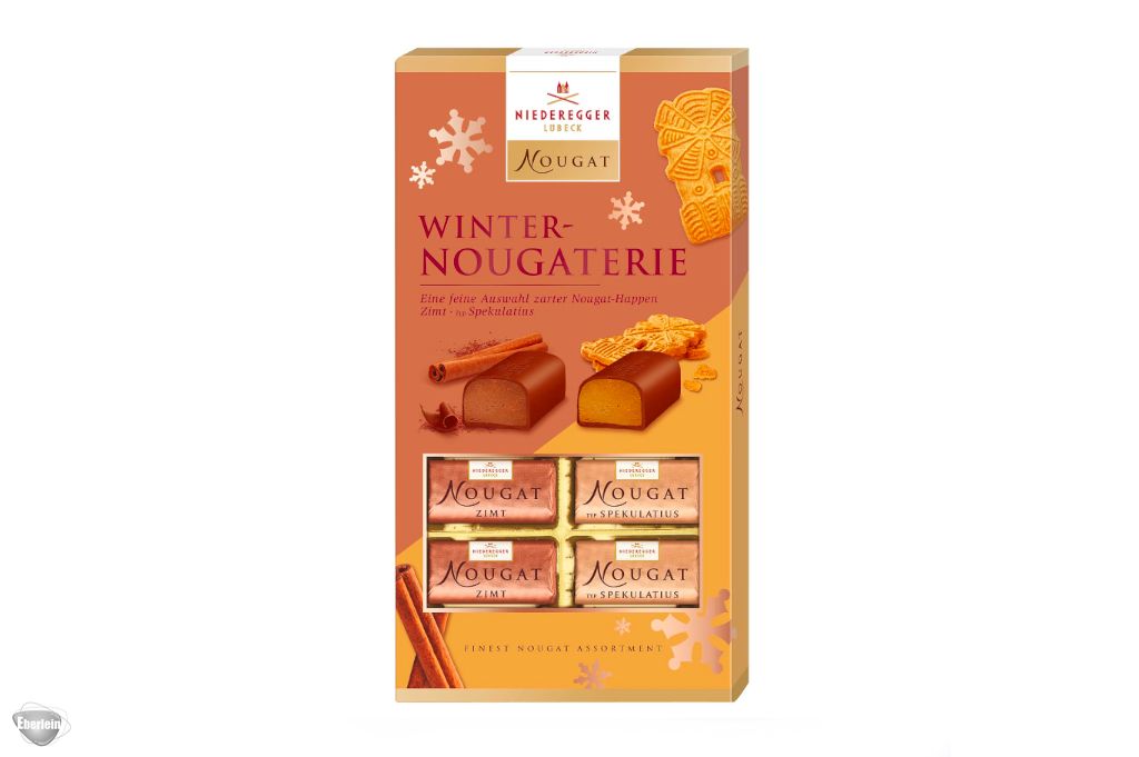 Winterlicher Genuss mit festlichem Flair - die Niederegger Nougat Winter-Nougaterie ist ein Muss für alle, die im Dezember gerne naschen. Diese edle Pralinenkomposition vereint zwei köstliche Nougatsorten, eingebettet in feinste Vollmilchschokolade.