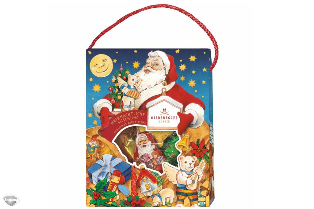 Überraschen Sie Marzipan-Liebhaber mit Niederegger "Weihnachtliche Mischung". Die feinen Marzipan-Figuren sind mit Zartbitter- oder Vollmilchschokolade umhüllt, die die Leckereien vollends zu einem Genuss macht. Als kleine Geschenkidee oder Mitbringsel in der Weihnachtszeit macht sich dieses kleine Täschchen mit dem nostalgischen Motiv und dem praktischen Tragegriff ganz hervorragend.