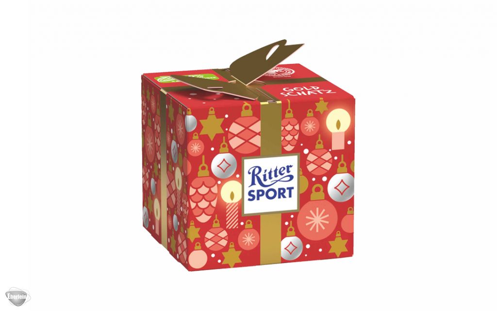Eckiger Christbaumschmuck. Der Ritter Sport Mini Christbaumwürfel Goldschatz ist die dekorative Überraschung für die Festtage. Der Würfel ist mit knackigen Vollmilchschokoladen-Minis gefüllt und lässt sich dank des praktischen Hängers mit einer Schleife im Weihnachtsbaum platzieren. Schmücken Sie Ihren Baum mit dieser etwas anderen "Kugel", aus der Sie hin und wieder naschen können.