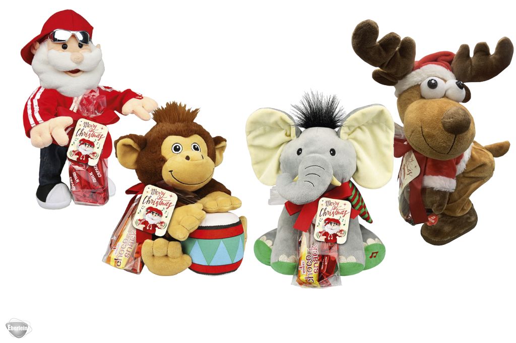 Jede Plüschfigur spielt Musik und hat einen Beutel mit Schokolade umhängen