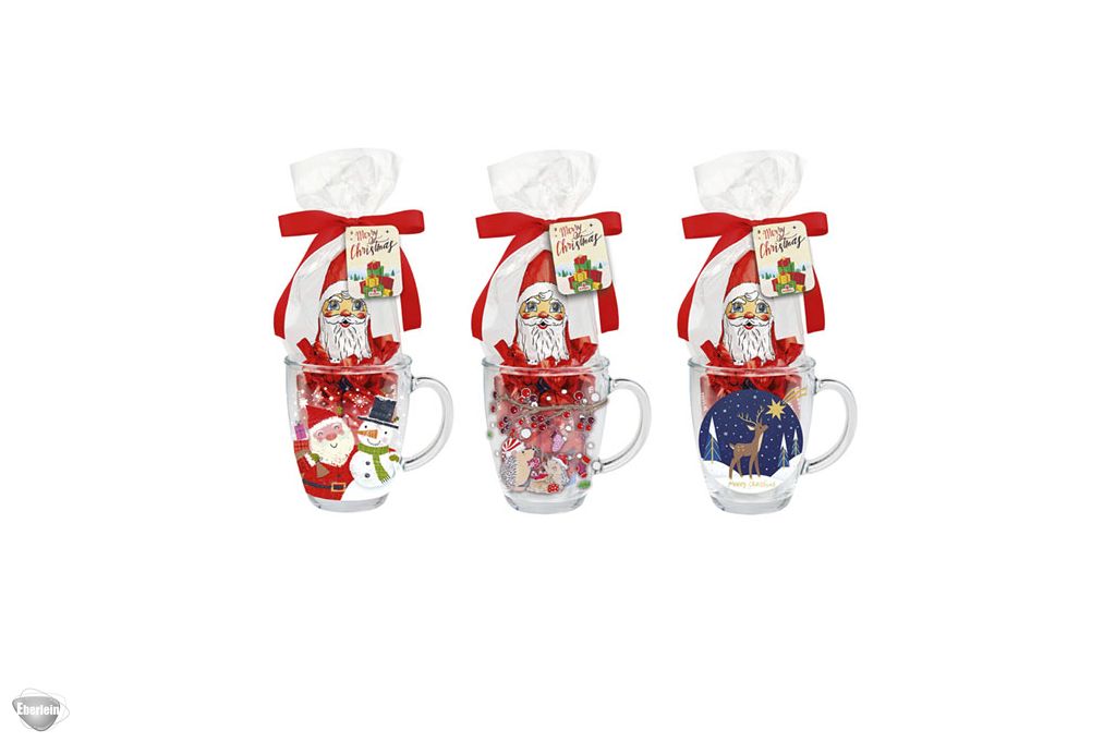 Die Tasse ist mit Schokolade mit Milchcremefüllung und einem Schokoladen - Weihnachtsmann gefüllt, mit Folie umhüllt