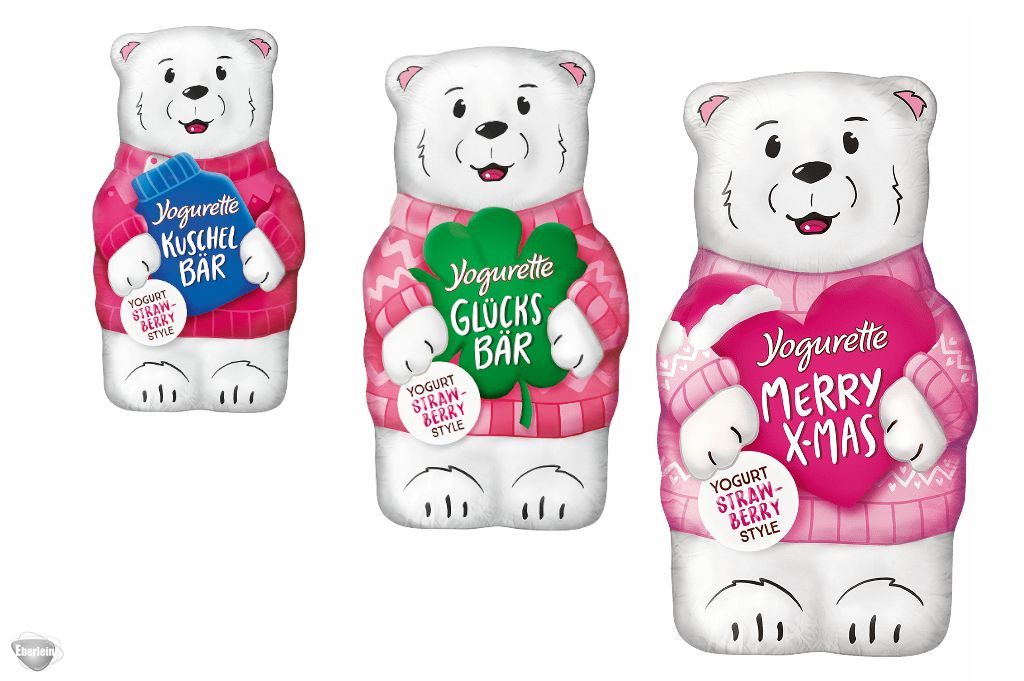 Ein erfrischender Genuss für die Weihnachtszeit! Der neue Yogurette Eisbär erstrahlt im rosaroten Look und beschert Ihnen ein ganz besonderes Geschmackserlebnis. Der niedliche Teddy besteht aus weißer Schokolade, die mit köstlichen Joghurt-Geschmack verführt. Eine intensive Erdbeernote sorgt dabei für fruchtige Genussmomente.