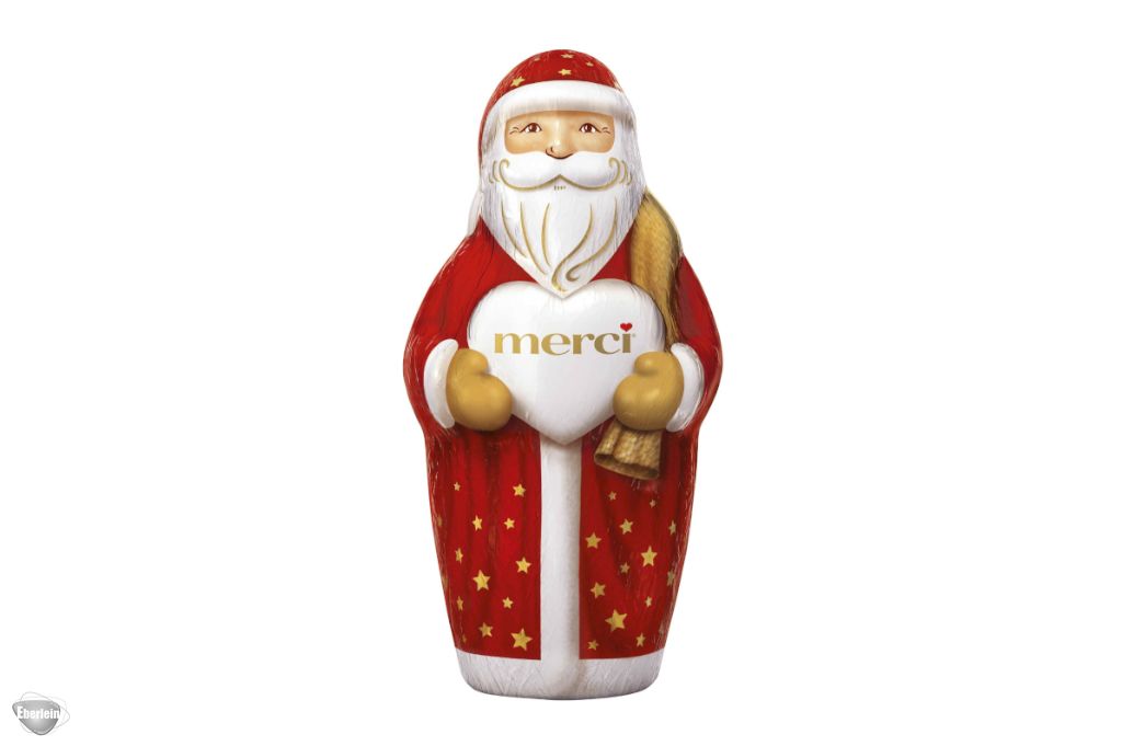 Die besonders süße Art sich zu bedanken ist der merci Weihnachtsmann. Denn die Weihnachtsmann-Hohlfigur besteht aus köstlicher Edel-Vollmilch-Schokolade, die zart auf der Zunge zergeht und mit ihrem vollmundigen Geschmack Jung und Alt zum Träumen bringt.